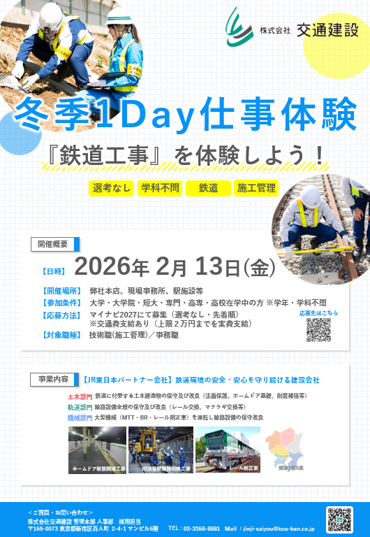 今年の冬も「1DAY仕事体験 職場&現場見学会」を開催します。